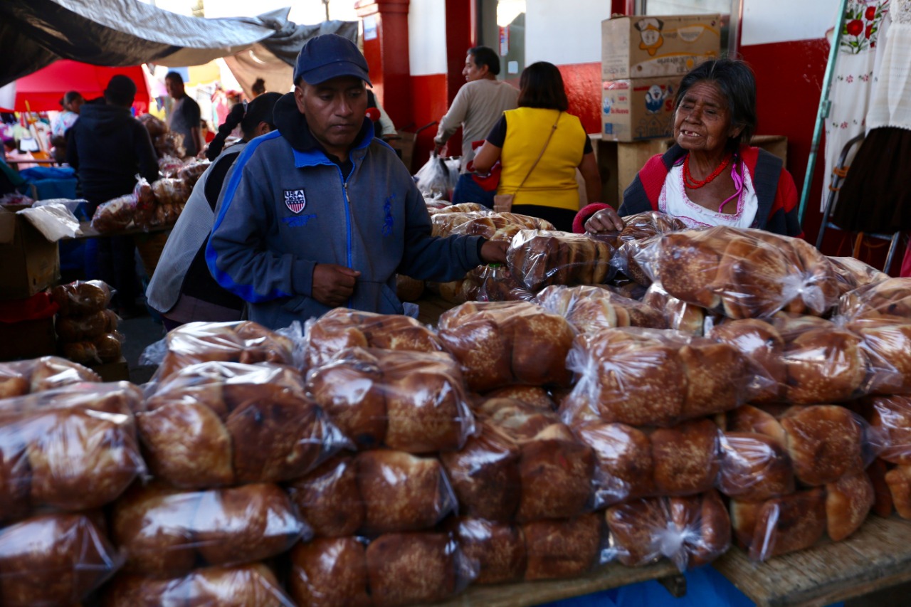 “Te cambio amarillito de alverja por pan”, negocia una mujer con vestido café claro, realizado a partir de algodón coyuchi, con otra que luce blusa de manta bordada en cuello y mangas, falda de holán al aire, de popelina con flores estampadas y rebozo negro; a lo largo y ancho de la plaza la escena se sucede, incluso a los pies de la casa donde vivió, al lado de su madre, Rufino Tamayo.