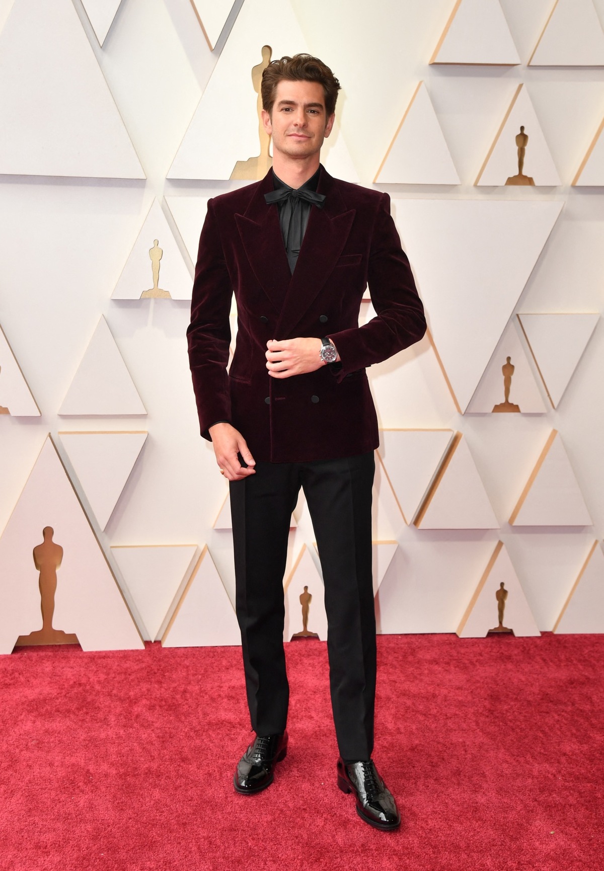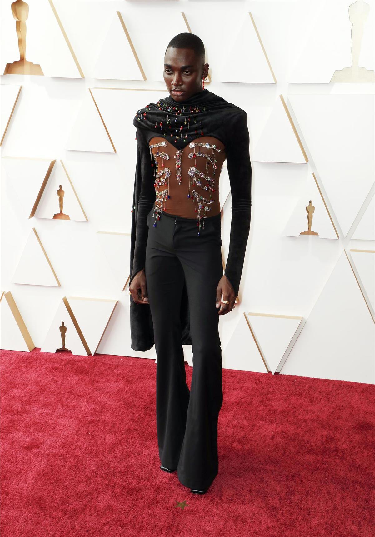 Con un traje ajustado y una mascada sobre el cuello, así deslumbró el actor estadunidense en la entrega 94 de los premios Oscar.
