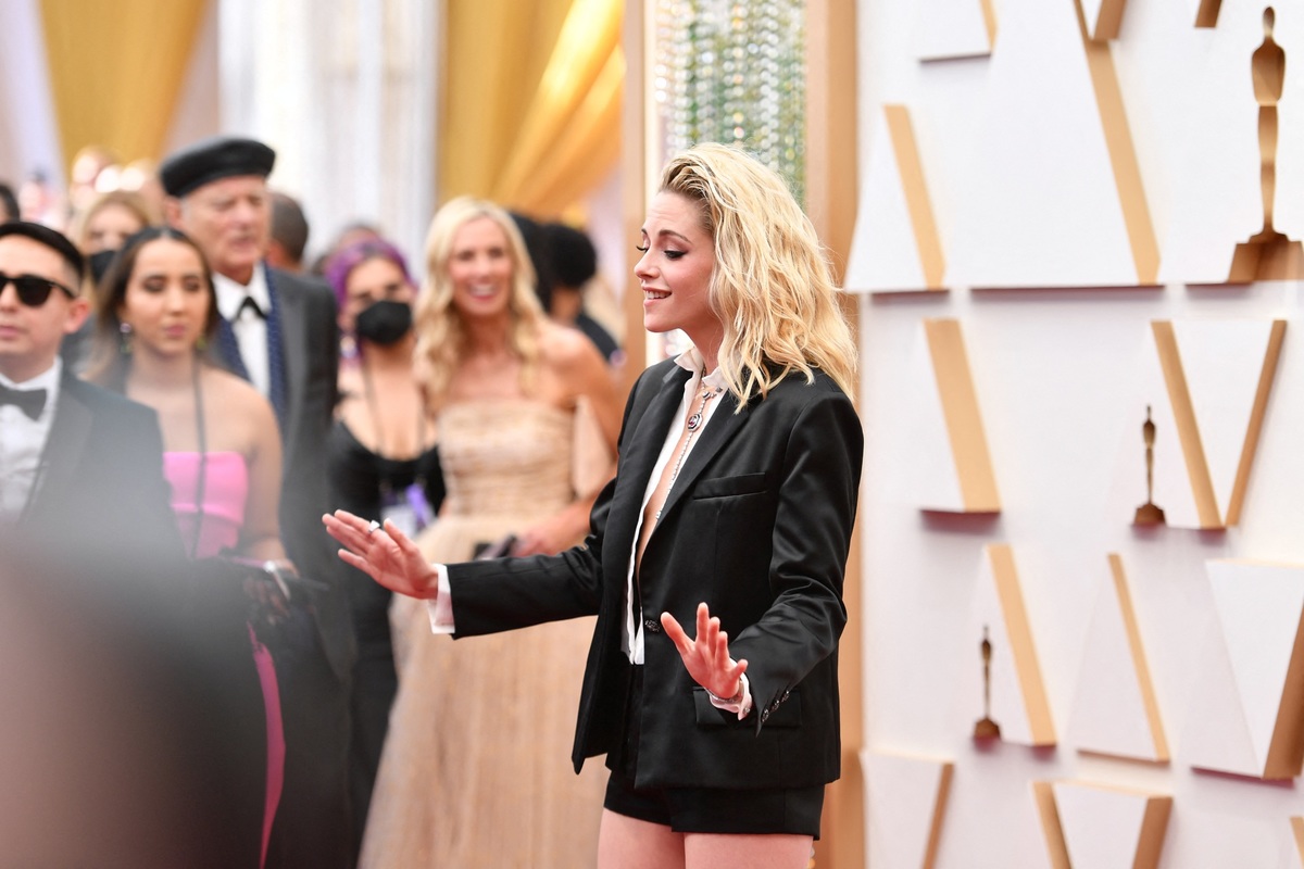 Con shorts y saco negro sastre, la actriz, nominada por 'Spencer', posó en la alfombra roja de los Premios Oscar 2022.