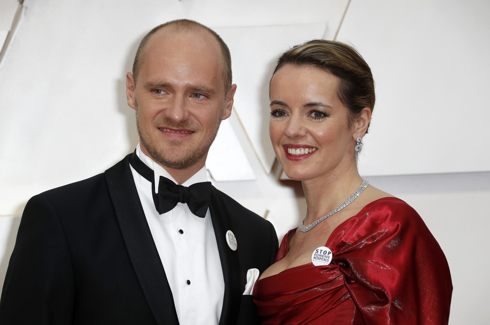 La actriz Olivia Scarlett-Watts posó junto a Edward Watts a su llegada al Teatro Dolby y una de las cosas que más llamó la atención fue el botón que usó en su vestido en el que se puede leer la frase: “Dejen de bombardear hospitales”.