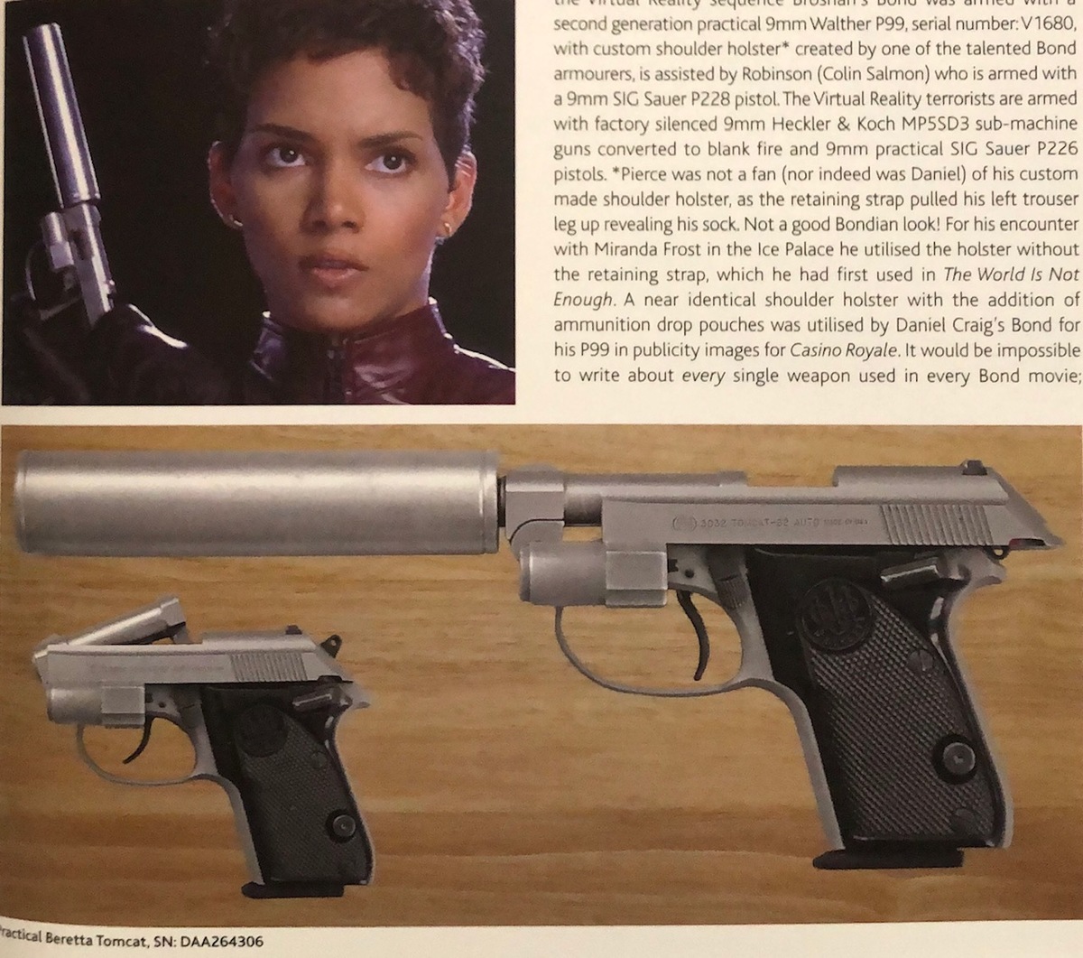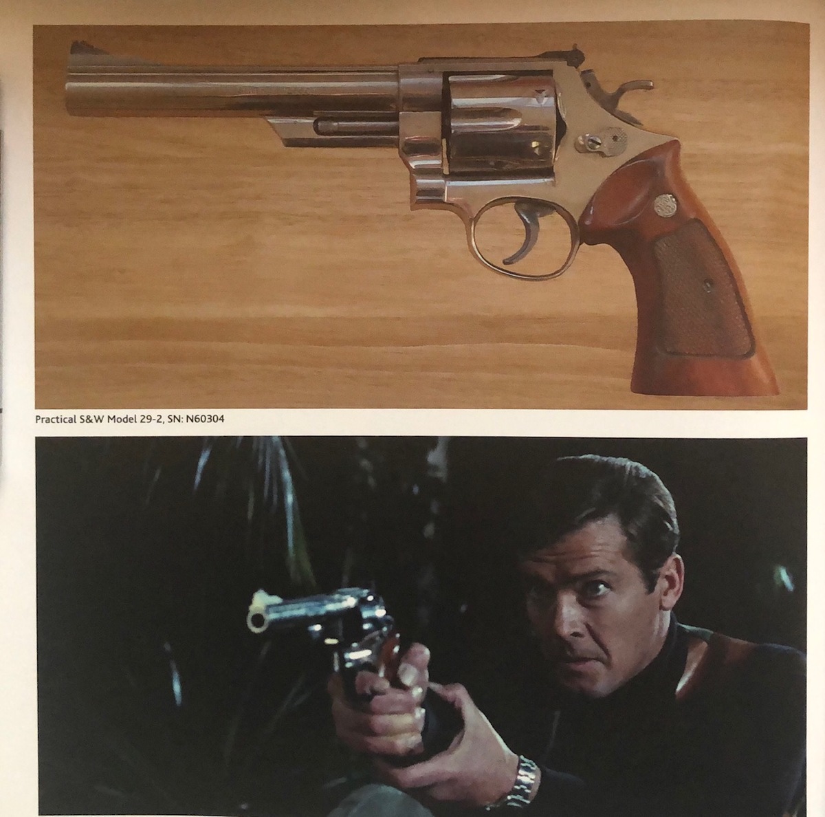 El potente revólver Magnum es el único en el mundo cromado por completo, la Walther PPK es la última que utiliza Roger Moore en la escena de En la mira de los asesinos, en la cual la actriz Grace Jones (May Day) es lanzada desde la Torre Eiffel en paracaídas.