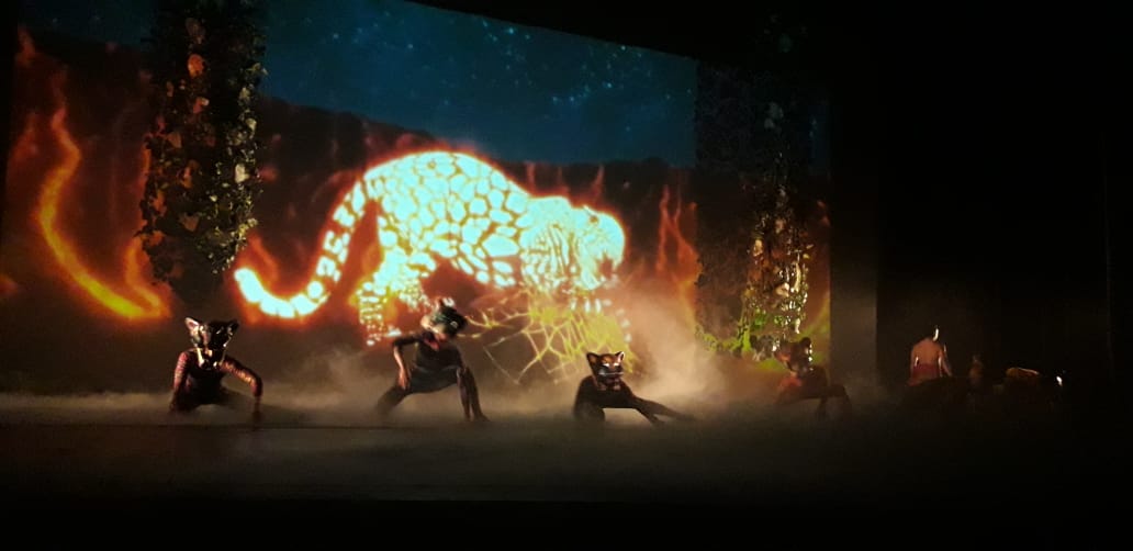 Las luces del recinto se apagaron y un video iluminó la pared de atrás del escenario, imágenes que permanecieron a lo largo de la función, cambiando de acuerdo con la época representada; el inicio, llevó al público a la gran Tenochtitlán.