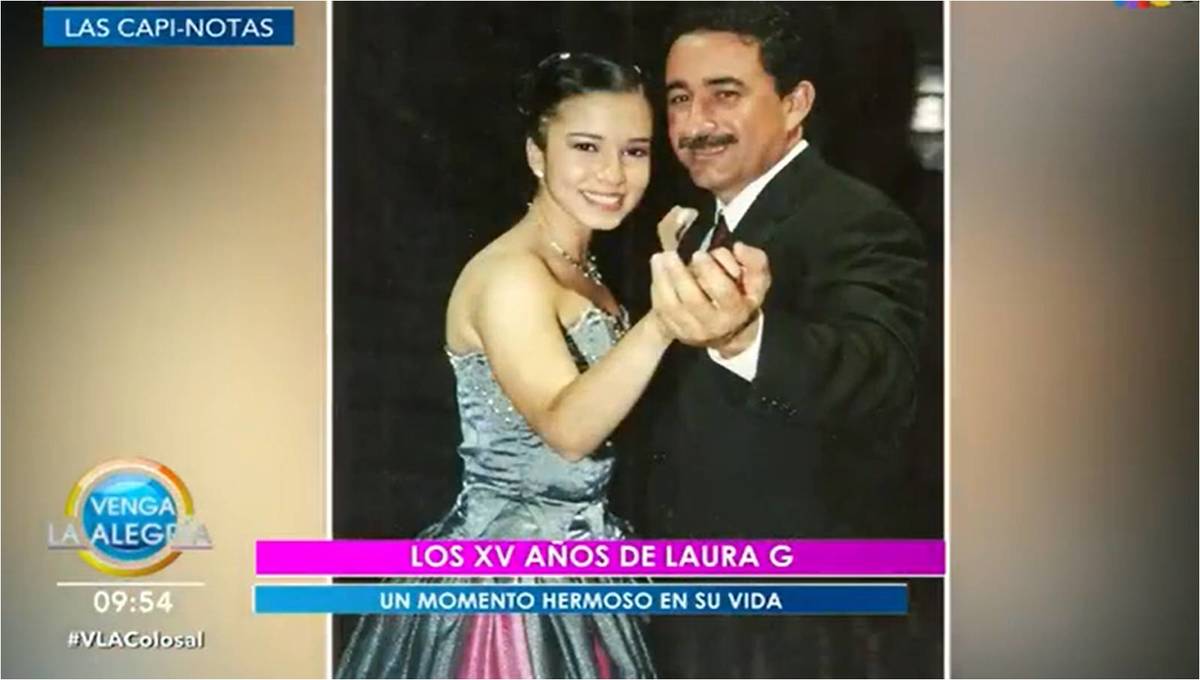 Todo sucedió en la sección de Capi Notas cuando el comediante recordó el día que Laura G celebró sus XV años. En la primera foto se observa a la famosa, quien actualmente tiene 36 años, luciendo un vestido gris con rosa, el cual fue confeccionado por su tía; en la segunda, aparece a lado de su papá.