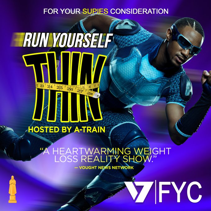 También A-Train tuvo su premio ficticio: "¡A-Train es un entrenador motivacional tan intenso que muchos de nuestros concursantes perdieron varios kilos solo por derramar lágrimas! Pero como dice el Blue Blur cada semana: 'Las lágrimas son la debilidad abandonando el cuerpo". ¡Corre, no camines, para ver este clásico del fitness!"