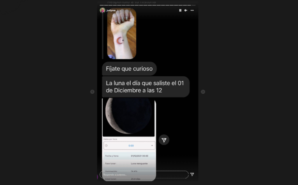 “Fíjate que curioso, la luna el día que saliste el 01 de diciembre a las 12″, escribió por mensaje privado en Instagram.