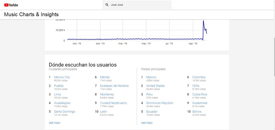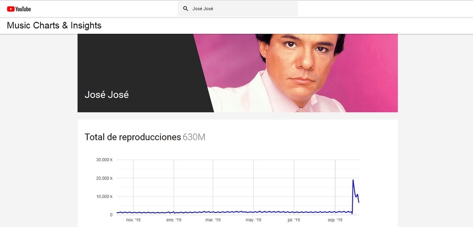 José José se coloca en el segundo lugar de la lista Top Artists de YouTube en México, mientras que aparece dentro de los primeros 15 puestos en países como Nicaragua, El Salvador, Guatemala y Costa Rica del 27 de septiembre al 3 de octubre de 2019, informó YouTube en un comunicado.