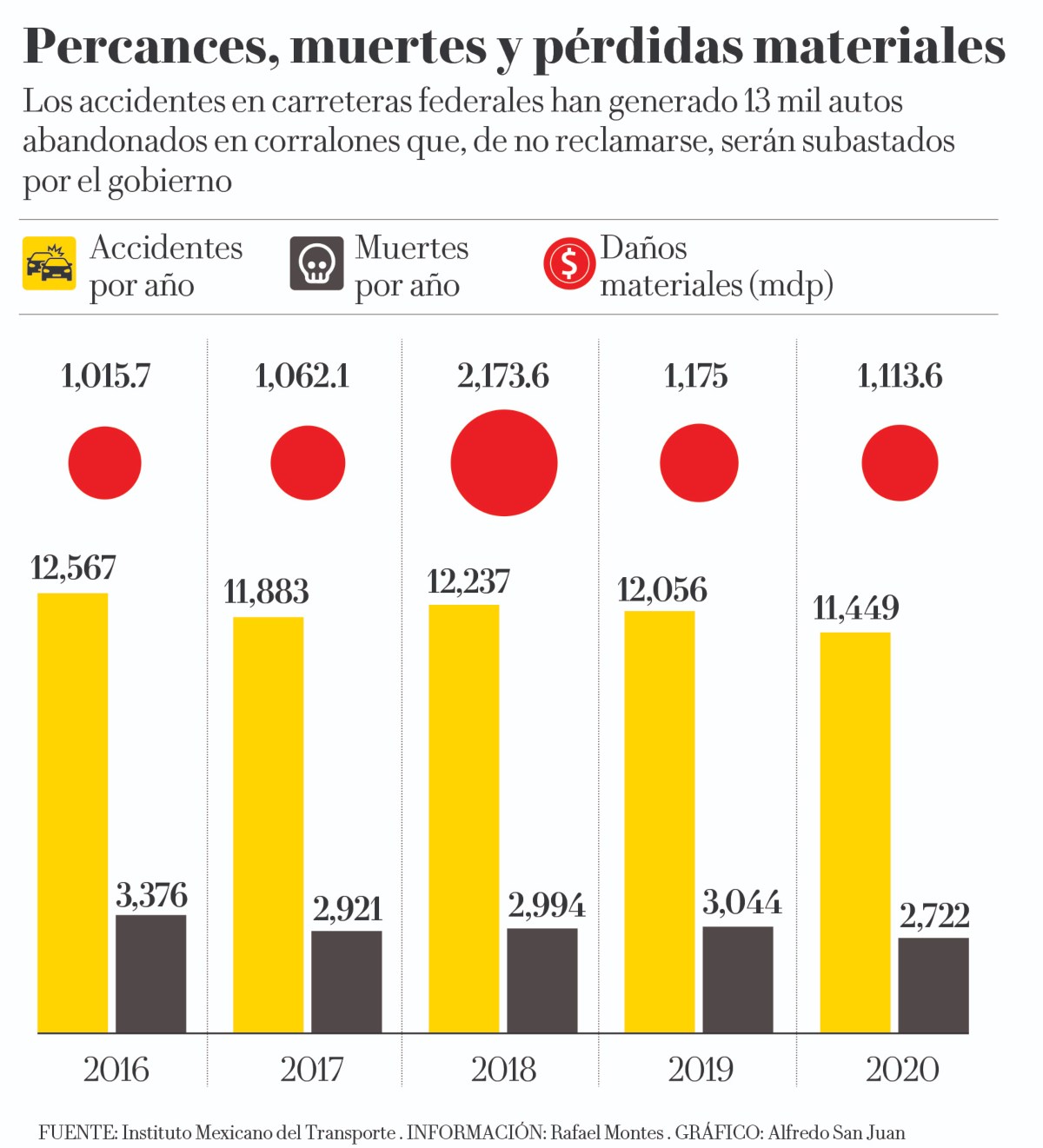 Una muestra de los daños materiales que dejan los accidentes en las carreteras federales son los autos que quedan abandonados tras los siniestros, de los cuales hay acumulados a la fecha más de 13 mil en corralones de la Secretaría de Infraestructura, Comunicaciones y Transportes (SICT).