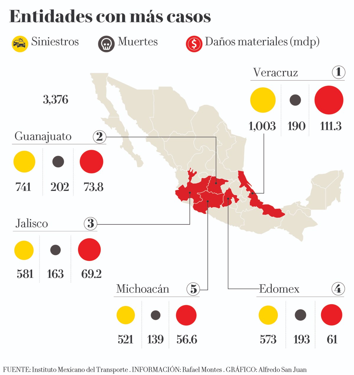 Después está Michoacán, con 521 accidentes, 139 fallecimientos y 56.6 millones de pesos en daños materiales, y Nuevo León, con 339 accidentes, 92 muertos y daños por 50.1 millones de pesos.