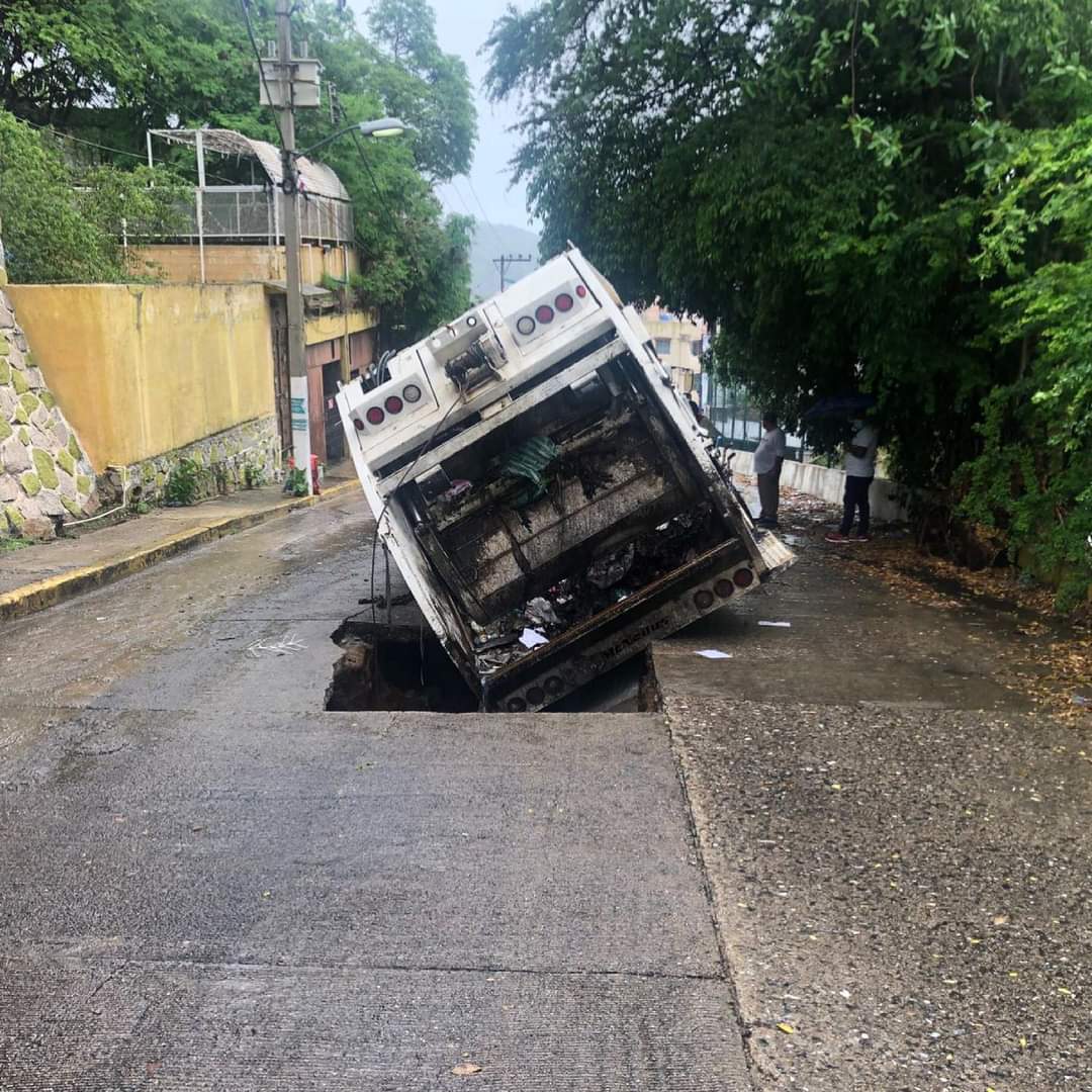 Un camión recolector de basura, perteneciente a Saneamiento Básico Municipal de Acapulco, cayó en un socavón, mientras brindaba el servicio en la avenida Gran Vía Tropical.