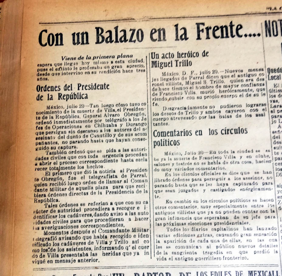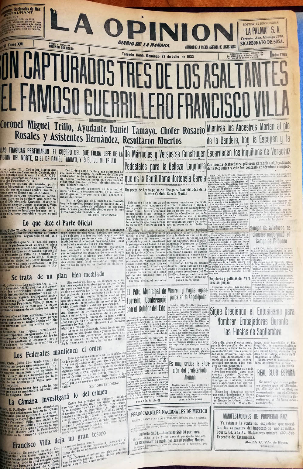 Fue un sábado 21 de julio de 1923 en que el diario La Opinión amanecía con el encabezado “Con un balazo en la frente y dos en el corazón, sucumbió ayer Francisco Villa”, esta noticia cimbró a los principales círculos sociales ya que este guerrillero en una época estuvo a punto de conducir el destino de México al encabezar la División del Norte.
