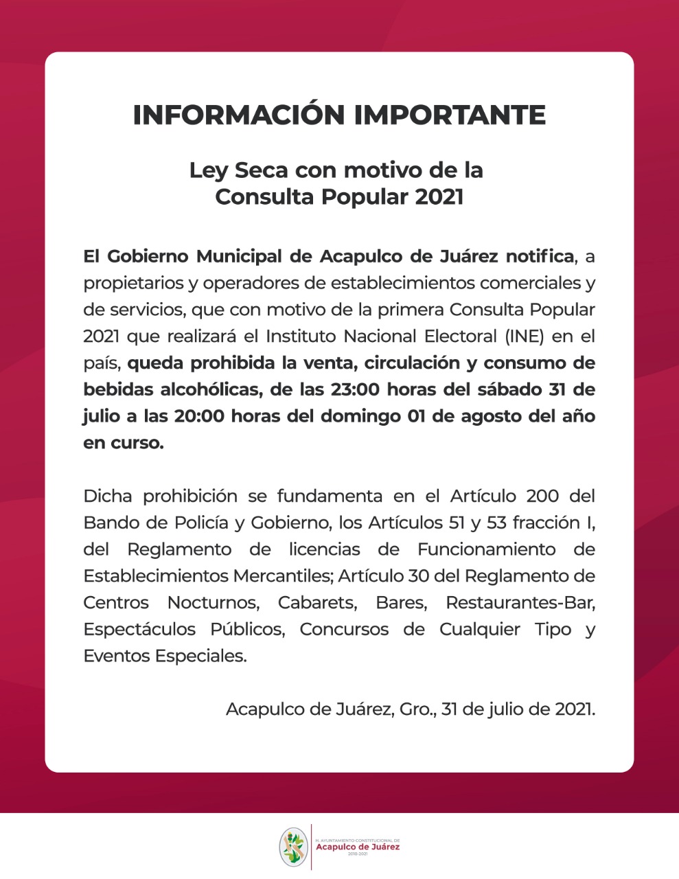 En Acapulco, a partir de las 23:00 horas de este sábado se aplicará la “Ley Seca”, y hasta las 20:00 horas del domingo, por la consulta popular que organiza el Instituto Nacional Electoral (INE) en todo el país.