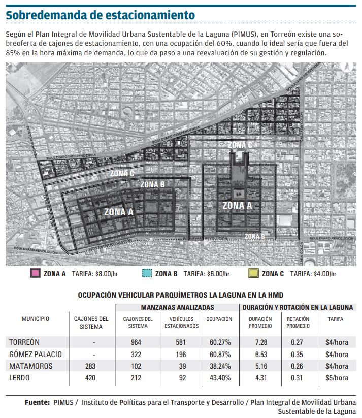 Actualmente en Torreón, la zona de parquímetros en el centro de la ciudad, es una realidad, sin embargo, según el Plan Integral de Movilidad Urbana Sustentable de la Laguna (PIMUS), existe una sobreoferta de cajones, además, su nivel de ocupación es del 60%, cuando lo ideal sería que fuera del 85% en la hora máxima de demanda, lo que da paso a una reevaluación de su gestión y regulación.