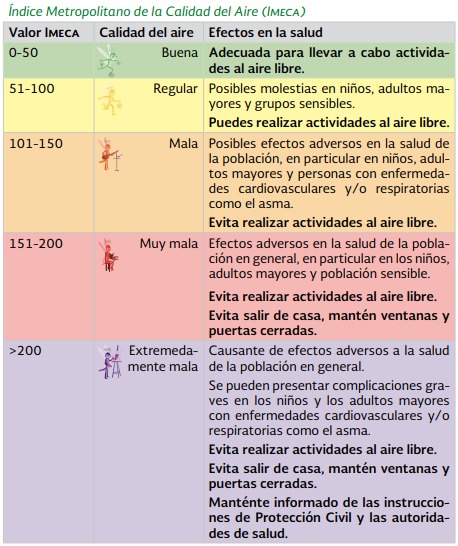 Las estaciones de monitoreo arrojan el índice de calidad del aire según las cifras registradas por los métodos ya mencionados, dependiendo de las intensidad de los contaminantes en el aire se hará un diagnóstico según la escala siguiente:
