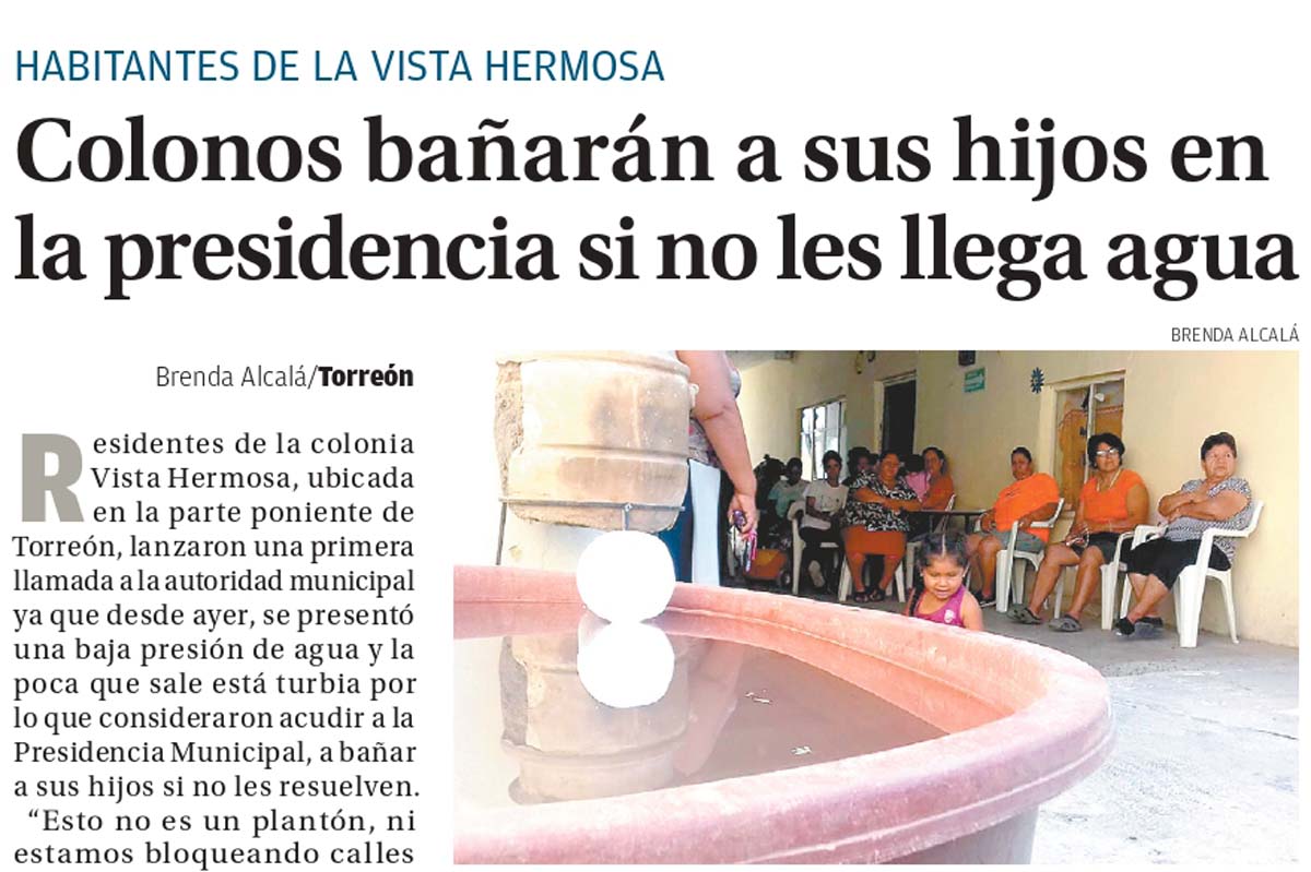 Debido a las altas temperaturas y la escasez de agua que desde entonces de hacía presente, vecinos de la colonia Vista Hermosa al poniente de Torreón, amenazaron a autoridades con "bañar a sus hijos en Presidencia", si no se resolvía el problema.