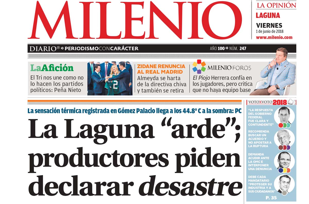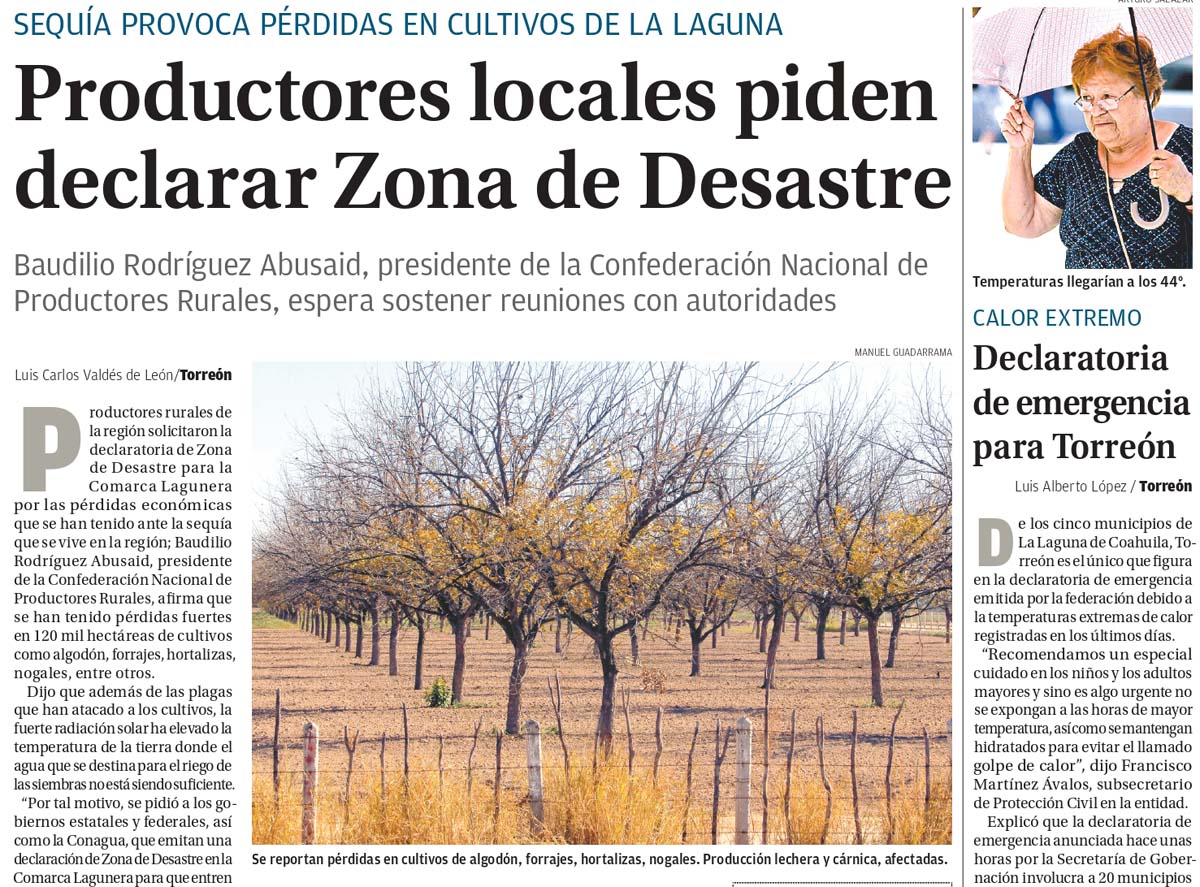 Acompañando el encabezado de la portada sobre el calor se podría leer que los productores rurales de la Comarca Lagunera solicitaron la declaratoria de 'Zona de Desastre' debido a las pérdidas económicas que se habían tenido ante la sequía.