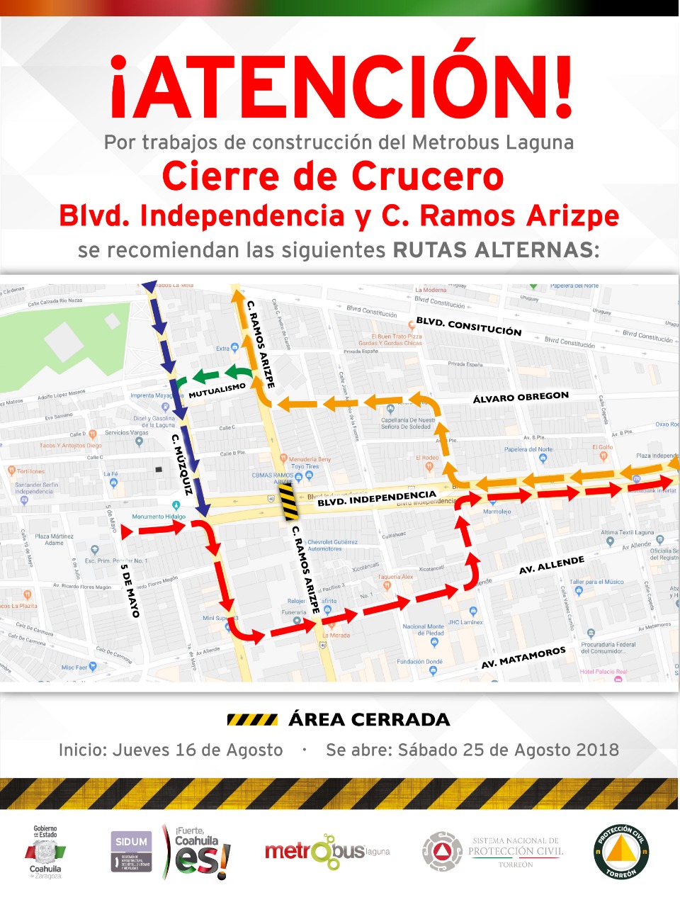 El Organismo de Regulador del Transporte Masivo de Coahuila informó que se cerrará la circulación la calle Ramos Arizpe y bulevar Independencia a partir de este jueves hasta el sábado.