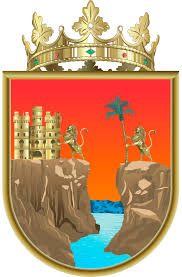 Por encima de la otra sierra, a mano izquierda, aparece una palmera verde con su fruta, con otro león rampante, también apoyado en el costado derecho de la palmera, todo ello en campo rojo y arriba hay una corona.