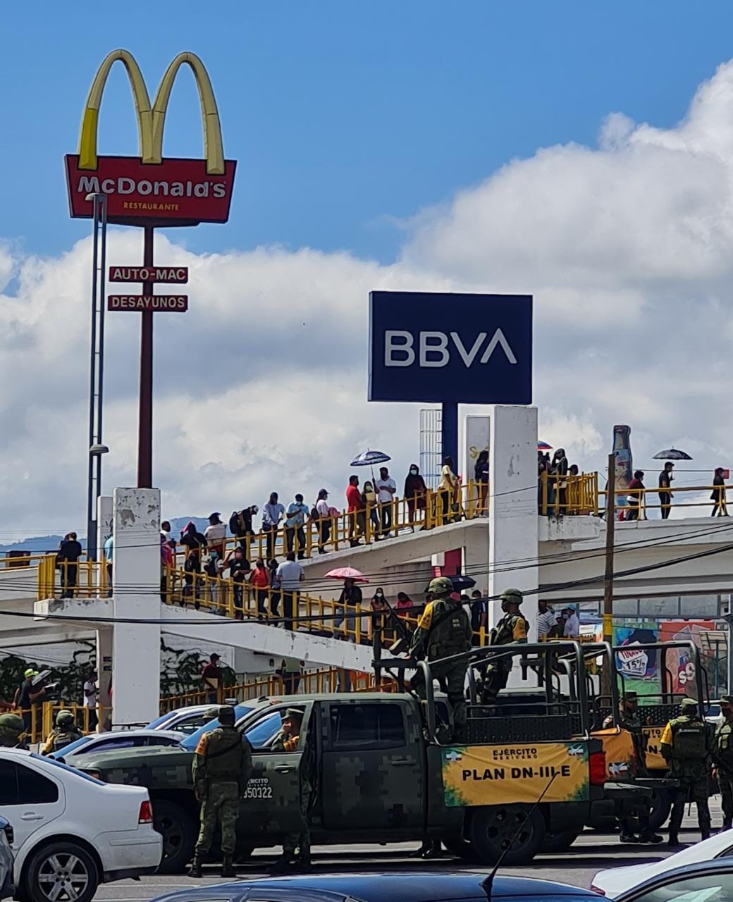 La fila, en el caso del centro de vacunación instalado en la colonia del PRI, inició en las canchas techadas del asentamiento humano y llegó hasta el estacionamiento del centro comercial Mega Soriana, por lo que atravesaba el boulevard en la parte alta del puente peatonal y rodeaba el mercado de la referida colonia.