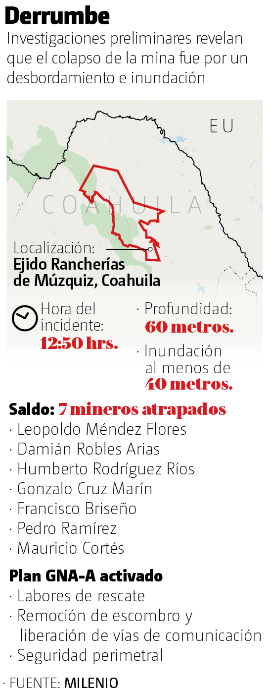 Ayer, la mina de la empresa Micarán, ubicada en el municipio de Múzquiz, Coahuila, colapsó debido a una inundación y dejó a siete trabajadores atrapados, de los cuales ya se rescató el cuerpo de uno.