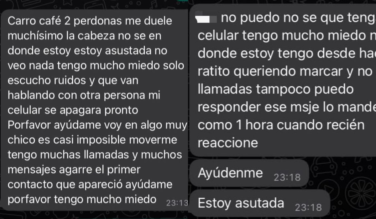 “Carro café dos personas, me duele muchísimo la cabeza, no sé en dónde estoy, estoy asustada, no veo nada, tengo mucho miedo, escucho ruidos y que hablan con otras personas, mi celular se apagará pronto, por favor ayúdenme voy en algo muy chico es casi imposible moverme, tengo muchas llamadas y muchos mensajes, agarre el primer contacto que apareció ayúdenme por favor tengo mucho miedo”, se puede leer en los mensajes.