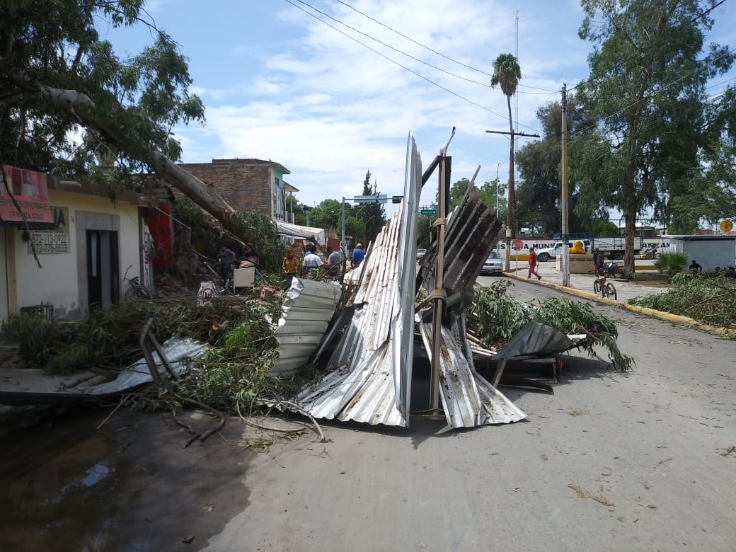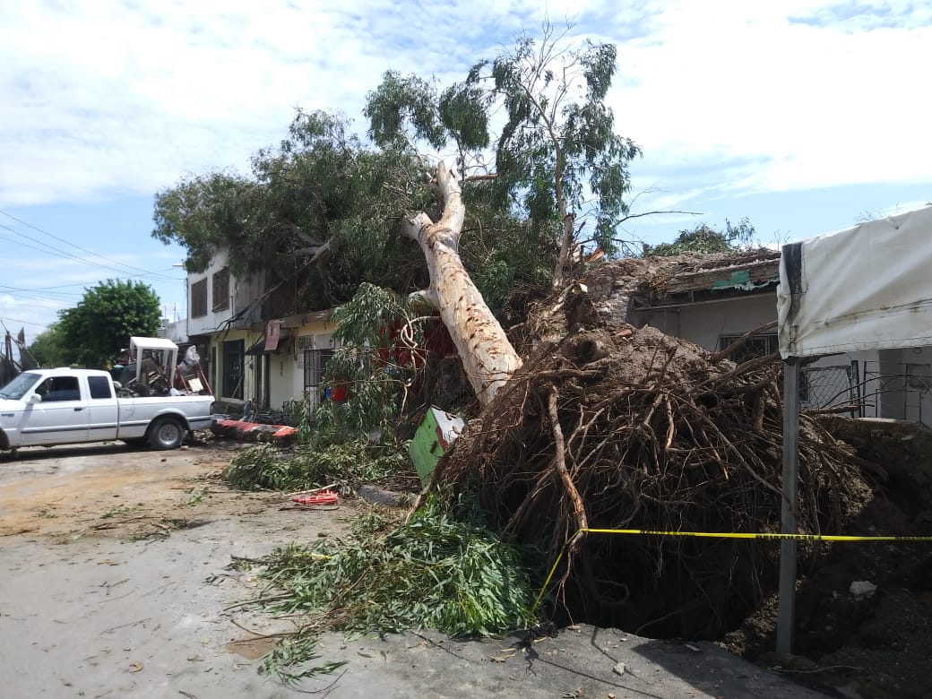 En la avenida Constitución del Barrio Monterrey pedían auxilio para una familia que encima de su casa se cayó un poste y un árbol. Y si de árboles se trata, el que les cayó a los encargados de Torres Carnitas, negocio que está por la calle Adolfo López Mateos y avenida Hidalgo, el árbol salió de raíz por el fuerte viento y cayó encima del negocio.