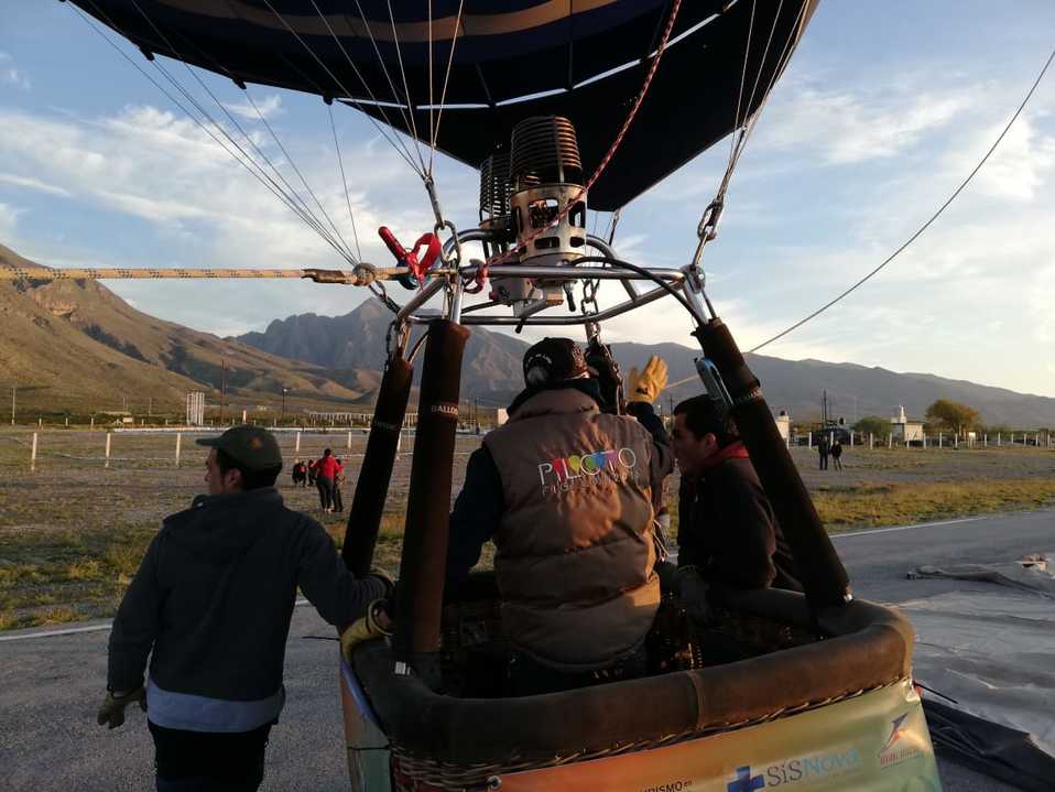 Aunque el viento complicó los planes e impidió que tres de los cuatro globos aerostáticos pusieran elevarse, la touroperadora Rosy Rivera junto varios torreonenses fueron de las privilegiados en subir al único globo que logró elevarse aprovechando una pausa en la velocidad del viento.