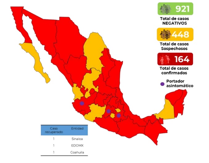 En conferencia de prensa, la Secretaría de Salud informó que hasta hoy 19 de marzo se han detectado 164 casos confirmados de coronavirus y se han descartado 921 sospechosos.