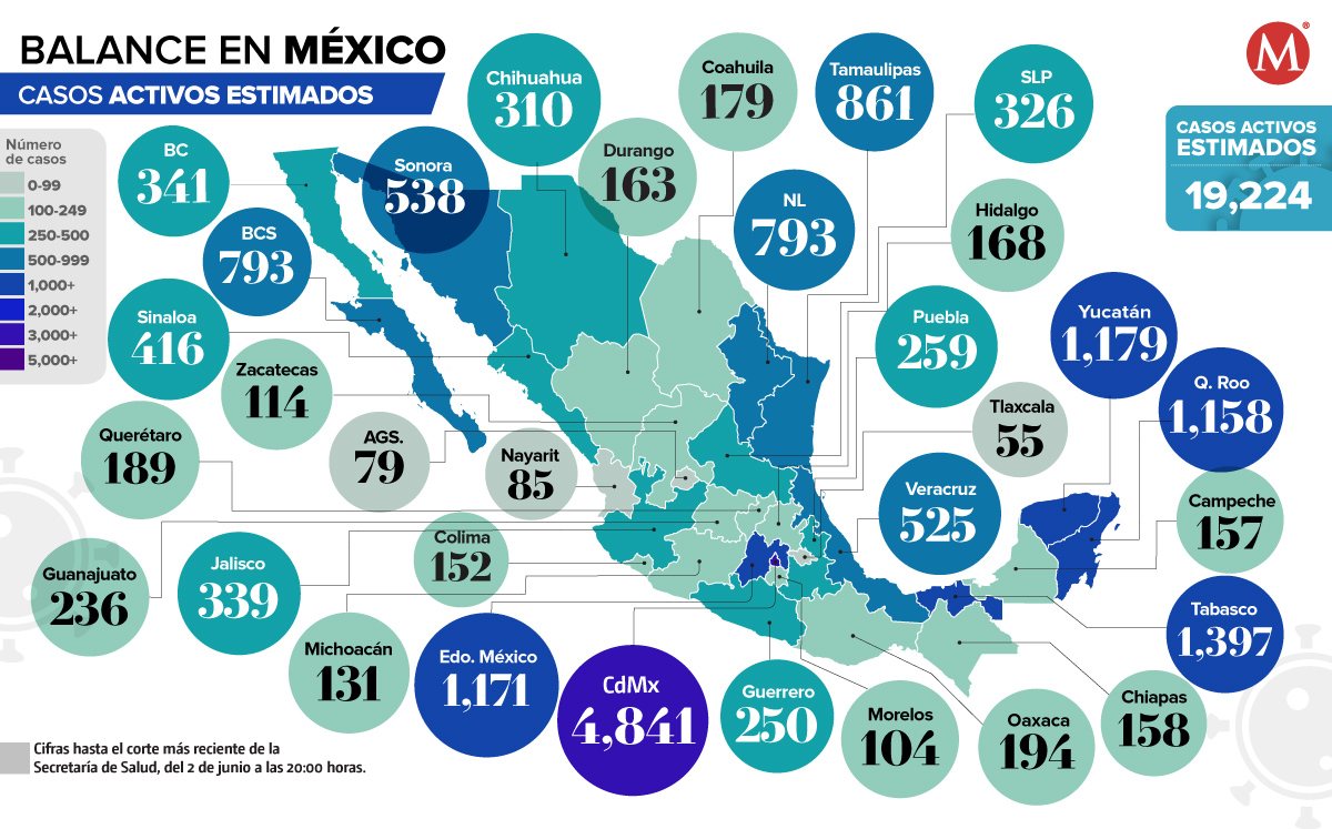La Ciudad de México y el Estado de México son las entidades con la mayor cantidad de casos activos estimados de coronavirus; mientras que Tlaxcala tiene la menor cifra.