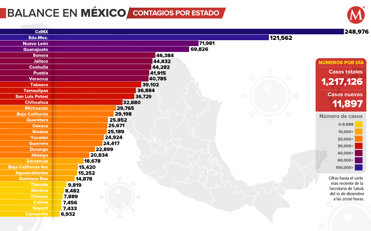 Querétaro es el estado con mayor tasa de incidencia de casos activos de coronavirus, con 100.67 casos por cada 100 mil habitantes; mientras que la Ciudad de México tiene la mayor tasa acumulada, con 2 mil 760.68 casos por cada 100 mil habitantes.
