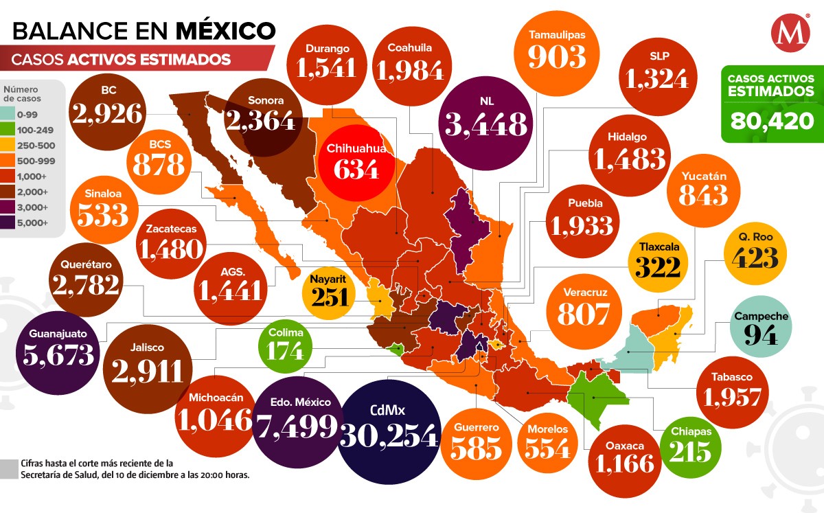 La Ciudad de México y el Estado de México son las entidades que más contagios activos estimados de covid-19 tienen; mientras que Campeche es el estado con menos pacientes con la enfermedad.