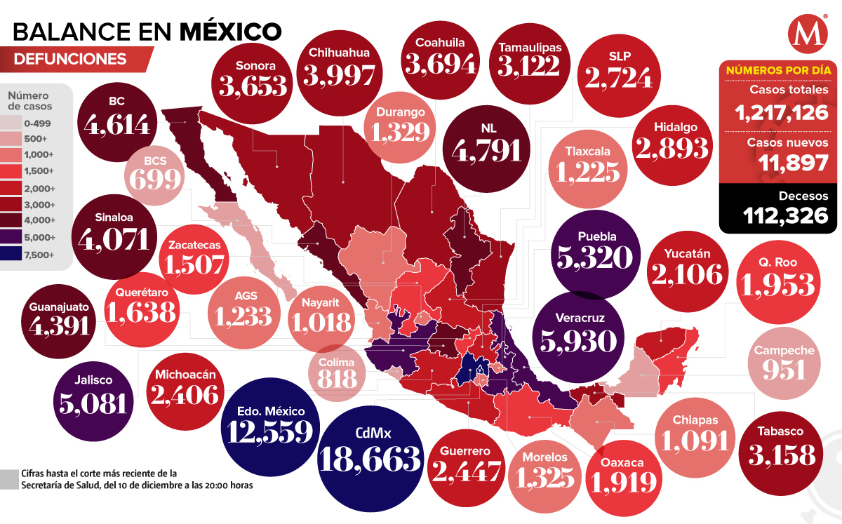 La Ciudad de México y el Estado de México son los estados que más muertes por coronavirus han acumulado; mientras que Baja California Sur ha acumulado menos defunciones.
