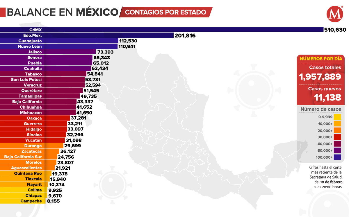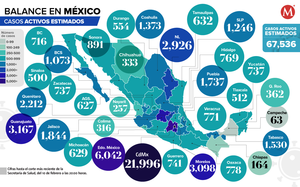 La Ciudad de México y el Estado de México son las entidades con mayor número de casos activos estimados de coronavirus; mientras que Campeche tiene la menor cifra.