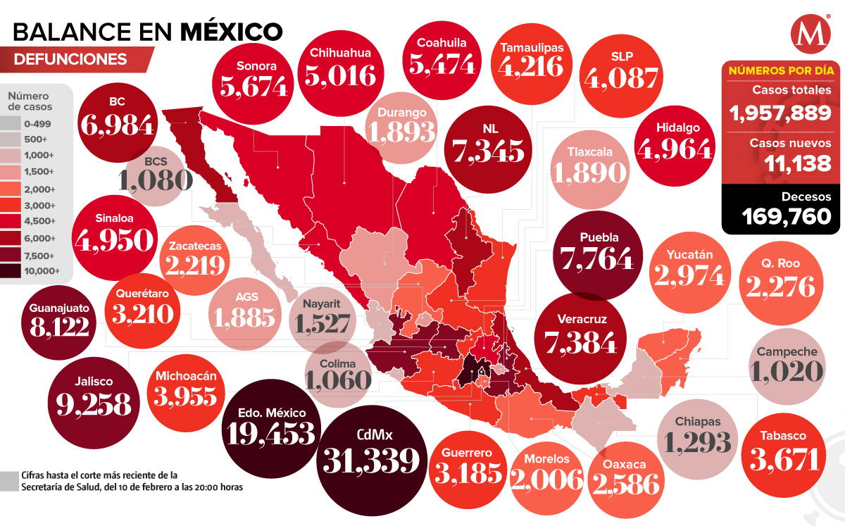 La Ciudad de México y el Estado de México son las entidades con mayor número de muertes por coronavirus, mientras que Baja California Sur tiene la menor cifra; sin embargo, todas las entidades superan las mil defunciones.