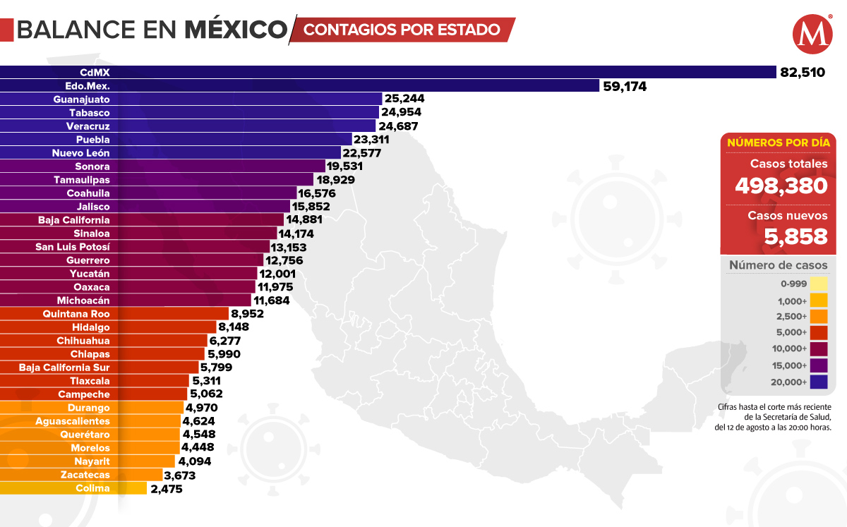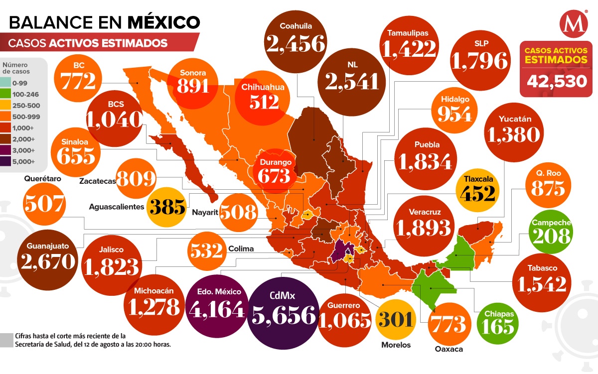 La Ciudad de México, el Estado de México, Guanajuato, Coahuila y Nuevo León son los estados con mayor cantidad de casos activos estimados; mientras que Campeche y Chiapas son los que tendrían menos pacientes con la enfermedad.