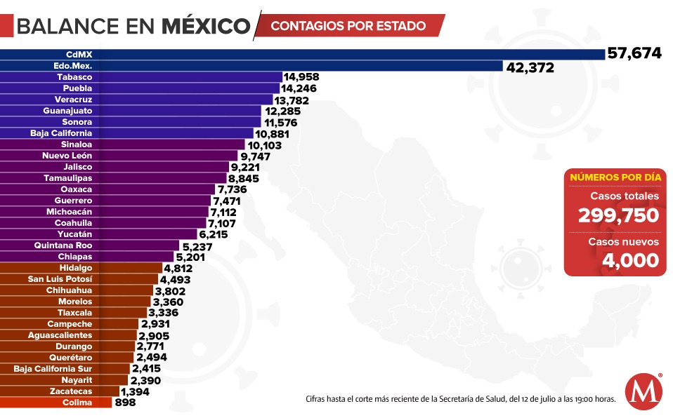La Ciudad de México y el Estado de México son las entidades que más casos han acumulado; son las únicas que han presentado más de 20 mil contagios.