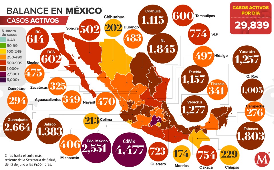 La Ciiudad de México y el Estado de México son las entidades con mayor número de casos activos. Además, en el país hay 11 estados que tienen más de mil contagios activos de la enfermedad.