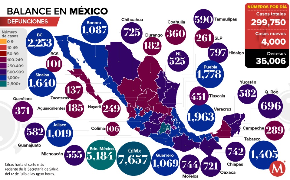 La Ciudad de México, el Estado de México y Baja California son las entidades con más muertes por covid-19. Mientras que suman 10 los estados que reportan más de mil defunciones.