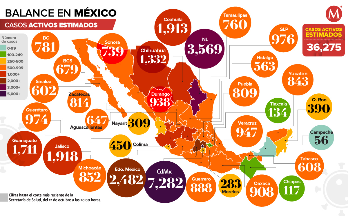 La Ciudad de México y Nuevo León son los estados que más casos activos acumulados estimados han reportado; mientras que Campeche es el que menos tiene y el único con menos de 100 pacientes con la enfermedad.