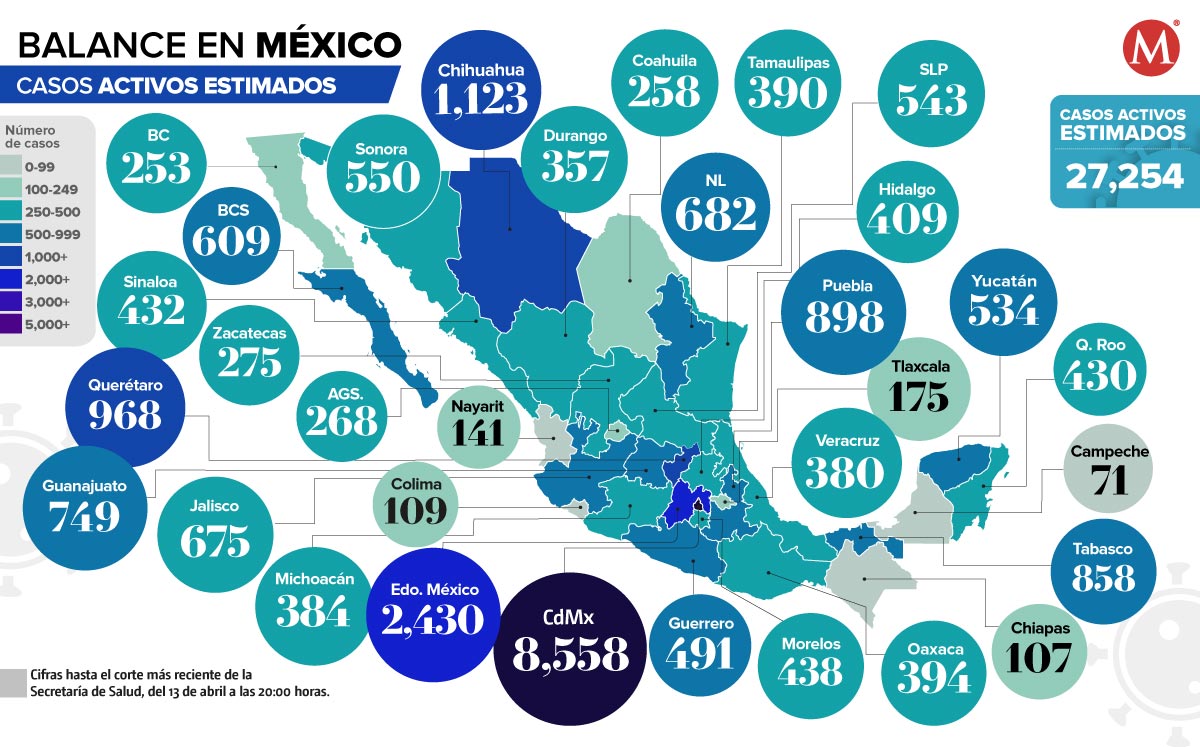 La Ciudad de México y el Estado de México son las entidades con la mayor cantidad de casos activos estimados de coronavirus; mientras que Campeche y Chiapas tienen la menor cifra.