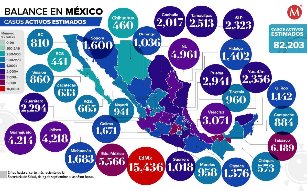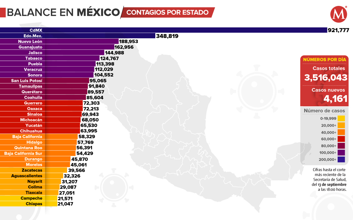 En contagios por estado, la Ciudad de México se mantiene en el primer puesto con 921 mil 777 contagios, seguido del Estado de México con 348 mil 819, Nuevo León con 188 mil 953 y Guanajuato con 162 mil 956.