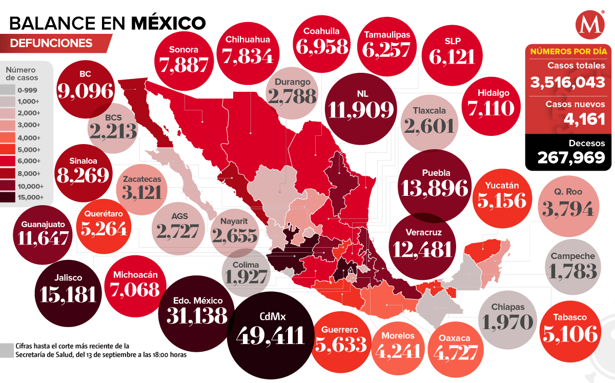 México registra un total de 267 mil 969 decesos, la Ciudad de México sumó 49 mil 411 defunciones, seguido del Estado de México con 31 mil 138, Jalisco con 15 mil 181 y Puebla con 13 mil 896.