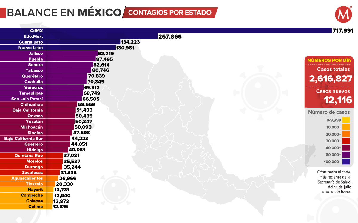 La Ciudad de México y el Estado de México son las entidades con la mayor cantidad de casos activos estimados de coronavirus; mientras que Tlaxcala tiene la menor cifra.