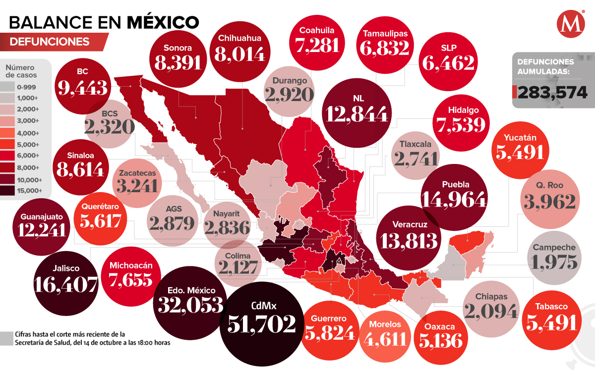 El país sumó en las últimas 24 horas 381 nuevas muertes, acumulando un total de 283 mil 574 defunciones. Asimismo, la Ciudad de México continúa en el primer puesto con 51 mil 702, seguido del Estado de México con 32 mil 053, Jalisco 16 mil 407, Puebla con 14 mil 964 y Veracruz con 13 mil 813.