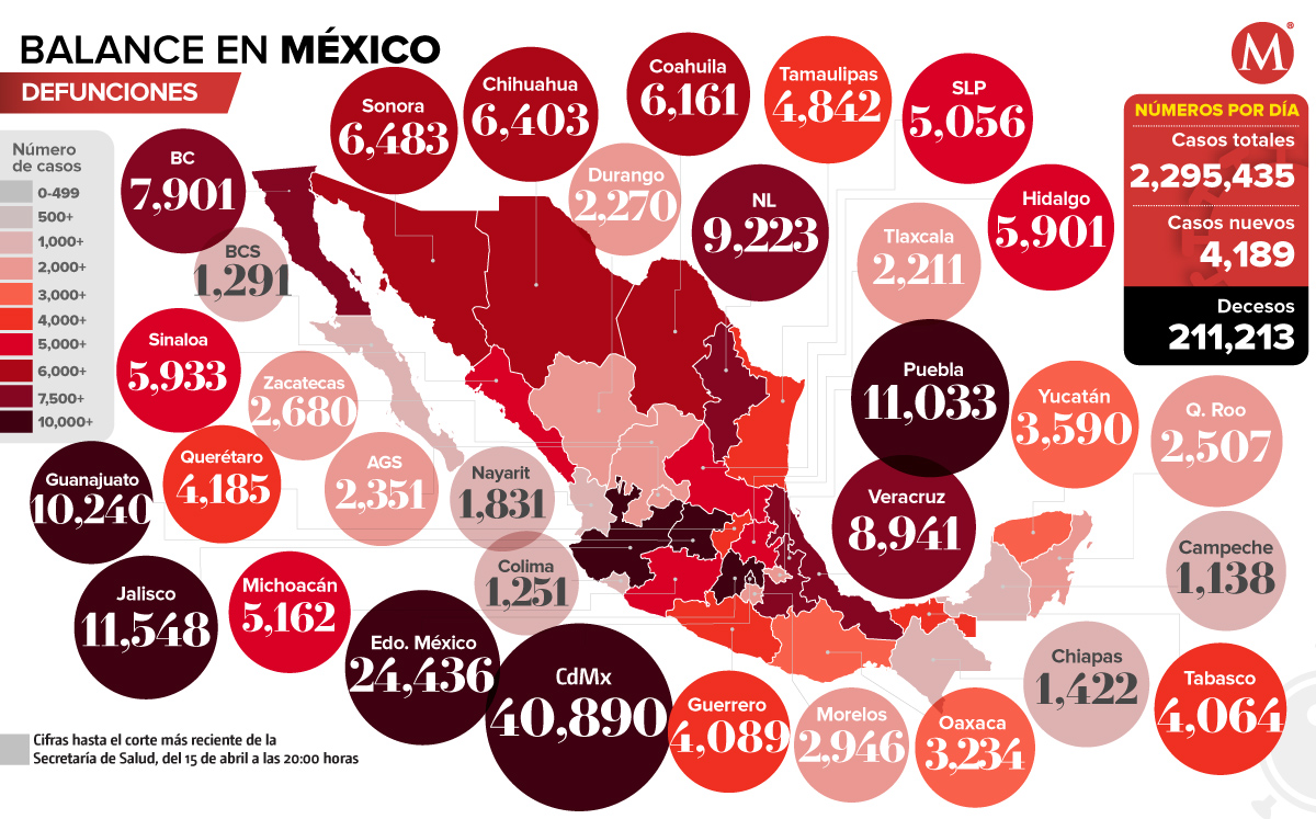 La Ciudad de México y el Estado de México son las entidades con la mayor cantidad de muertes; mientras que Campeche tiene la menor cifra.
