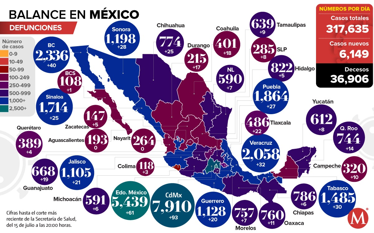 Mientras que las defunciones confirmadas por covid-19 son 36 mil 906, pero se estima que han muerto aproximadamente 38 mil 838 personas por coronavirus.