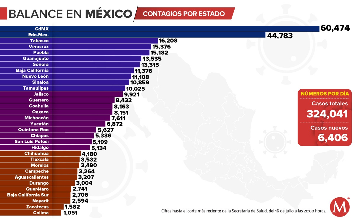 La ciudad de México, el Estado de México, Baja California y Veracruz son las entidades que más muertes han acumulado y entre las cuatro, han reportado 52 por ciento del total de defunciones en el país.