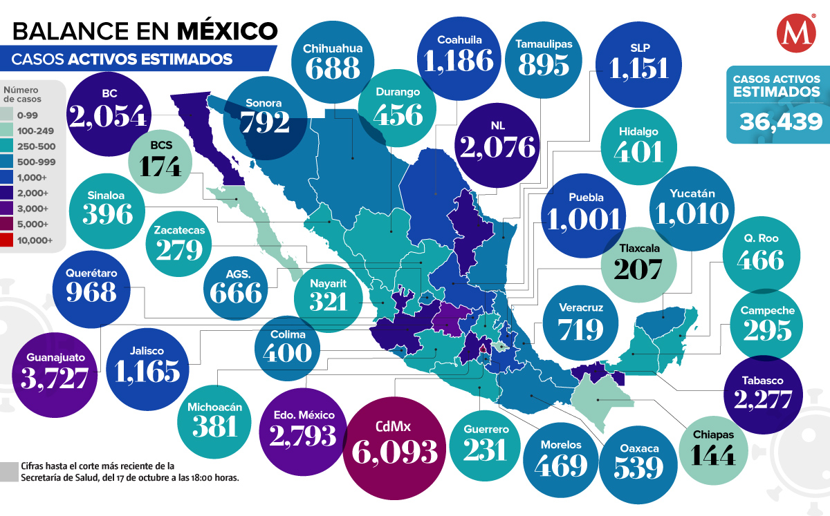 En contagios por estado, la Ciudad de México se mantiene en la primera posición con 962 mil 766, seguido del Estado de México con 370 mil 598, Nuevo León con 201 mil 601 y Guanajuato con 183 mil 285.