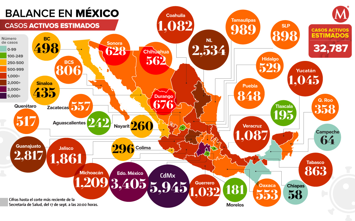 La Ciudad de México y el Estado de México son los estados con mayor número de casos activos de coronavirus; mientras que Chiapas y Campeche son las entidades con menos contagios.