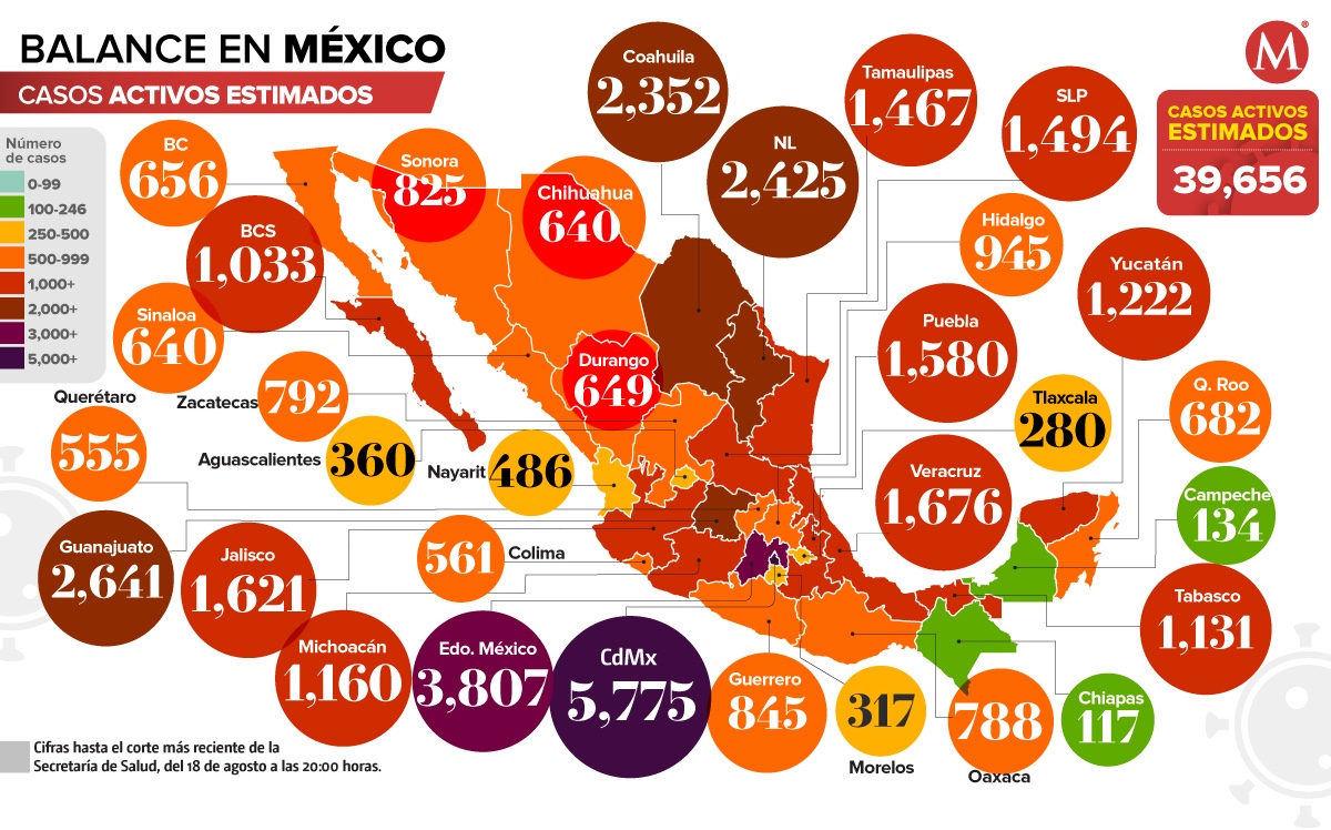 La Ciudad de México y el Estado de México se mantienen como las entidades con mayor número de casos estimados de covid-19; mientras que Campeche y Chiapas son los estados con menor estimación de contagios.