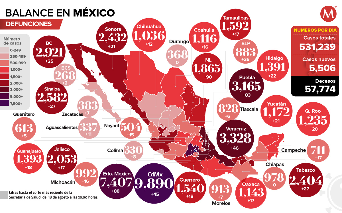 La Ciudad de México, el Estado de México, Veracruz y Puebla son las entidades con más muertes por covid-19; mientras que Colima es el estado con menos defunciones confirmadas.